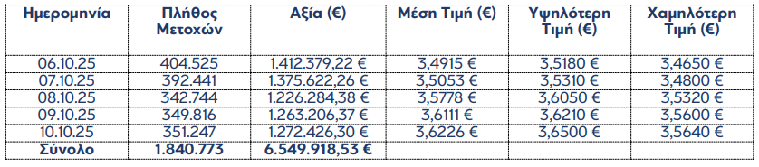Η «Eurobank Ergasias Υπηρεσιών και Συμμετοχών Ανώνυμη Εταιρεία» («Eurobank Holdings»), σε συνέχεια της από 07.05.2025 ανακοίνωσής της σχετικά με την έναρξη εφαρμογής του Προγράμματος Επαναγοράς Ιδίων Μετοχών («Πρόγραμμα»), που εγκρίθηκε με την απόφαση της Τακτικής Γενικής Συνέλευσης των Μετόχων της Eurobank Holdings στις 30.04.2025 και σε συνέχεια της από 30.04.2025 απόφασης του Διοικητικού Συμβουλίου της, ενημερώνει το κοινό ότι κατά το διάστημα 06/10/2025 – 10/10/2025 απέκτησε συνολικά, στο πλαίσιο του Προγράμματος, 1.840.773 μετοχές εκδόσεως της ιδίας («Ίδιες Μετοχές») που διαπραγματεύονται στο Χρηματιστήριο Αθηνών («Χ.Α.»), με μέση τιμή κτήσης €3,5582, ανά μετοχή και συνολικό κόστος €6.549.918,53.