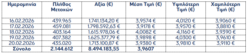 Η «Τράπεζα Eurobank Ανώνυμη Εταιρεία» (εφεξής η «Eurobank» ή η «Τράπεζα»), σε συνέχεια της από 12.12.2025 ανακοίνωσής της σχετικά με την έναρξη εφαρμογής του Προγράμματος Επαναγοράς Ιδίων Μετοχών («Πρόγραμμα»), το οποίο εγκρίθηκε με την απόφαση της Έκτακτης Γενικής Συνέλευσης των Μετόχων της Τράπεζας στις 22.10.2025, σύμφωνα με το άρθρο 49 του ν. 4548/2018, σε συνέχεια του αντίστοιχου προγράμματος της «Eurobank Ergasias Υπηρεσιών και Συμμετοχών Ανώνυμη Εταιρεία» («Eurobank Holdings») που θεσπίστηκε με την απόφαση της από 30.04.2025 Τακτικής Γενικής Συνέλευσης των Μετόχων της τελευταίας, και σε συνέχεια της από 22.10.2025 απόφασης του Διοικητικού Συμβουλίου της, ενημερώνει το κοινό ότι κατά το διάστημα 16.02.2026 – 20.02.2026 απέκτησε συνολικά, στο πλαίσιο του Προγράμματος, 2.144.612 μετοχές εκδόσεως της ιδίας («Ίδιες Μετοχές») που διαπραγματεύονται στο Χρηματιστήριο Αθηνών («Χ.Α.»), με μέση τιμή κτήσης €3,9607 ανά μετοχή και συνολικό κόστος €8.494.183,55.