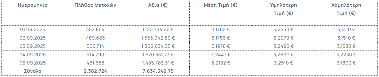 Η «Eurobank Ergasias Υπηρεσιών και Συμμετοχών Ανώνυμη Εταιρεία» («Eurobank Holdings»), σε συνέχεια της από 07.05.2025 ανακοίνωσής της σχετικά με την έναρξη εφαρμογής του Προγράμματος Επαναγοράς Ιδίων Μετοχών («Πρόγραμμα»), που εγκρίθηκε με την απόφαση της Τακτικής Γενικής Συνέλευσης των Μετόχων της Eurobank Holdings στις 30.04.2025 και σε συνέχεια της από 30.04.2025 απόφασης του Διοικητικού Συμβουλίου της, ενημερώνει το κοινό ότι κατά το διάστημα 01/09/2025 – 05/09/2025 απέκτησε συνολικά, στο πλαίσιο του Προγράμματος, 2.382.724 μετοχές εκδόσεως της ιδίας («Ίδιες Μετοχές») που διαπραγματεύονται στο Χρηματιστήριο Αθηνών («Χ.Α.»), με μέση τιμή κτήσης €3,2041, ανά μετοχή και συνολικό κόστος €7.634.546,75