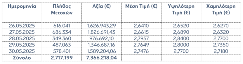 Η «Eurobank Ergasias Υπηρεσιών και Συμμετοχών Ανώνυμη Εταιρεία» («Eurobank Holdings»), σε συνέχεια της από 07.05.2025 ανακοίνωσής της σχετικά με την έναρξη εφαρμογής του Προγράμματος Επαναγοράς Ιδίων Μετοχών («Πρόγραμμα»), που εγκρίθηκε με την απόφαση της Τακτικής Γενικής Συνέλευσης των Μετόχων της Eurobank Holdings στις 30.04.2025 και σε συνέχεια της από 30.04.2025 απόφασης του Διοικητικού Συμβουλίου της, ενημερώνει το κοινό ότι κατά το διάστημα 26/5/2025 – 30/05/2025 απέκτησε συνολικά, στο πλαίσιο του Προγράμματος, 2.717.199 μετοχές εκδόσεως της ιδίας («Ίδιες Μετοχές») που διαπραγματεύονται στο Χρηματιστήριο Αθηνών («Χ.Α.»), με μέση τιμή κτήσης €2,7110, ανά μετοχή και συνολικό κόστος €7.366.218,04.