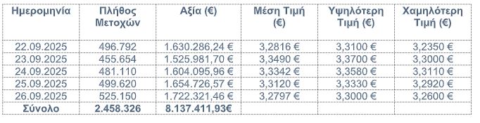 Προγράμματος Επαναγοράς Ιδίων Μετοχών («Πρόγραμμα»), που εγκρίθηκε με την απόφαση της Τακτικής Γενικής Συνέλευσης των Μετόχων της Eurobank Holdings στις 30.04.2025 και σε συνέχεια της από 30.04.2025 απόφασης του Διοικητικού Συμβουλίου της, ενημερώνει το κοινό ότι κατά το διάστημα 22/09/2025 – 26/09/2025 απέκτησε συνολικά, στο πλαίσιο του Προγράμματος, 2.458.326 μετοχές εκδόσεως της ιδίας («Ίδιες Μετοχές») που διαπραγματεύονται στο Χρηματιστήριο Αθηνών («Χ.Α.»), με μέση τιμή κτήσης €3,3101, ανά μετοχή και συνολικό κόστος €8.137.411,93