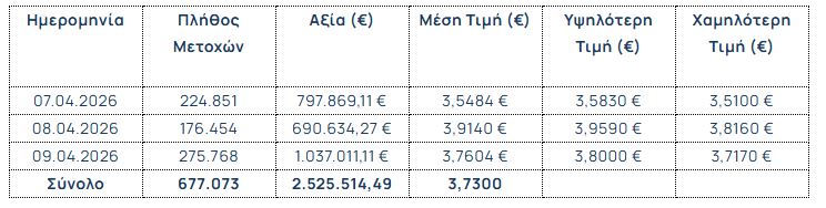 Η «Τράπεζα Eurobank Ανώνυμη Εταιρεία» (εφεξής η «Eurobank» ή η «Τράπεζα»), σε συνέχεια της από 12.12.2025 ανακοίνωσής της σχετικά με την έναρξη εφαρμογής του Προγράμματος Επαναγοράς Ιδίων Μετοχών («Πρόγραμμα»), το οποίο εγκρίθηκε με την απόφαση της Έκτακτης Γενικής Συνέλευσης των Μετόχων της Τράπεζας στις 22.10.2025, σύμφωνα με το άρθρο 49 του ν. 4548/2018, σε συνέχεια του αντίστοιχου προγράμματος της «Eurobank Ergasias Υπηρεσιών και Συμμετοχών Ανώνυμη Εταιρεία» («Eurobank Holdings») που θεσπίστηκε με την απόφαση της από 30.04.2025 Τακτικής Γενικής Συνέλευσης των Μετόχων της τελευταίας, και σε συνέχεια της από 22.10.2025 απόφασης του Διοικητικού Συμβουλίου της, ενημερώνει το κοινό ότι κατά το διάστημα 07.04.2026 – 09.04.2026 απέκτησε συνολικά, στο πλαίσιο του Προγράμματος, 677.073 μετοχές εκδόσεως της ιδίας («Ίδιες Μετοχές») που διαπραγματεύονται στο Χρηματιστήριο Αθηνών («Χ.Α.»), με μέση τιμή κτήσης €3,7300 ανά μετοχή και συνολικό κόστος €2.525.514,49.