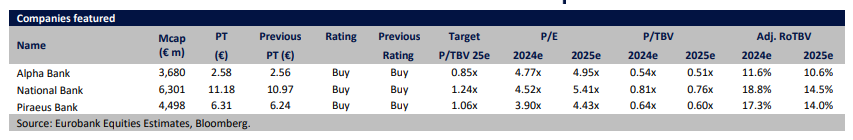 Στον απόηχο των ισχυρών αποτελεσμάτων γ’ τριμήνου, η χρηματιστηριακή ενίσχυσε τις εκτιμήσεις της για τα καθαρά κέρδη του τραπεζικού τομέα το 2024, κατά 5% (μέσος όρος), με μικρές αλλαγές για την περίοδο 2025-2026, οδηγώντας σε αυξήσεις κατά περίπου 2% στις τιμές στόχους.