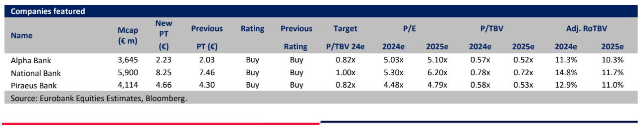 Η Eurobank Equities εκτιμά ότι οι ελληνικές τράπεζες είναι έτοιμες να ανταποκριθούν αποτελεσματικά στις μειώσεις των επιτοκίων και σε συνδυασμό με την ισχυρή κεφαλαιακή δημιουργία κεφαλαίου (άνω των 250 μ.β. έως το 2025), θα επιτρέψει την επανέναρξη της διανομής μερισμάτων. Η χρηματιστηριακή αυξάνει τις τιμές στόχους και η Τράπεζα Πειραιώς παραμένει κορυφαία επιλογή. Οι νέες τιμές στόχοι είναι 4,66 ευρώ από 4,30 για την Τράπεζα Πειραιώς, 8,25 ευρώ από 7,46 ευρώ για την Εθνική Τράπεζα και τέλος 2,23 ευρώ από 2,03 για τη Alpha Bank.