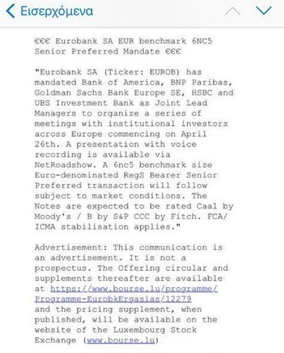 Οι νέοι τίτλοι της Eurobank αναμένεται να έχουν βαθμολογία Caa1 από την Moody’s, B από την S&P και CCC από την Fitch, ενώ είναι πλήρως επιλέξιμοι για το MREL.