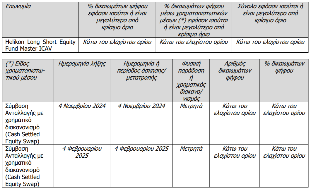 2. Σύμφωνα με τα προβλεπόμενα στο άρθρο 7α (παρ. 6 περ. γ) του ν. 3864/2010 και με βάση τη σχετική γνωστοποίηση που έλαβε η Εταιρεία από την Helikon, το ποσοστό των δικαιωμάτων ψήφου επί των κοινών μετοχών της Εταιρείας που κατείχε έμμεσα η Helikon, κατήλθε στις 04.02.2022 του ορίου του 5% επί του συνολικού αριθμού των δικαιωμάτων ψήφου της Εταιρείας, εξαιρουμένων των δικαιωμάτων ψήφου του ΤΧΣ, που αντιστοιχούν σε 182.128.920 δικαιώματα ψήφου επί των κοινών μετοχών της Εταιρείας.
