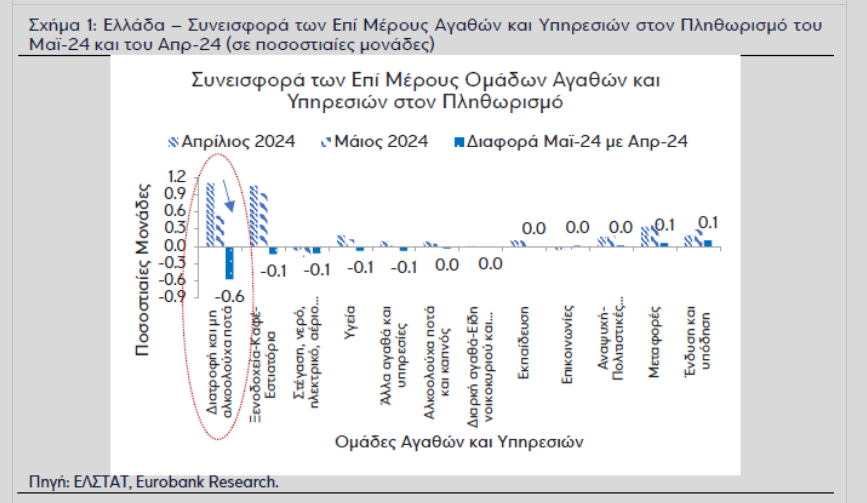 Τέλος, όπως παρουσιάζεται στο Σχήμα 1, η ομάδα αγαθών και υπηρεσιών που είχε τη μεγαλύτερη συμβολή στην επιβράδυνση του πληθωρισμού τον Μαϊ-24 ήταν αυτή τη διατροφής και μη αλκοολούχων ποτών -αφαίρεσε 0,6 ποσοστιαίες μονάδες σε σύγκριση με τον Απρ-24- και ακολούθησαν τα ξενοδοχεία-καφέ-εστιατόρια, η στέγαση, νερό, ηλεκτρικό αέριο και άλλα καύσιμα, η υγεία και τα άλλα αγαθά και υπηρεσίες. Αντιθέτως, οι μεταφορές και η ένδυση και υπόδηση πρόσθεσαν εν συνόλω 0,2 ποσοστιαίες μονάδες στον πληθωρισμό του Μαϊ-24 σε σύγκριση με τον Απρ-24.