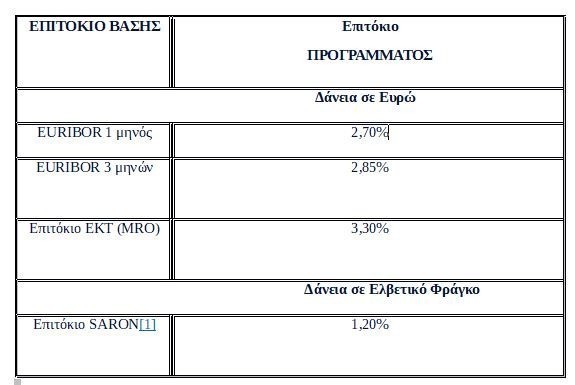 Ειδικότερα, ανάλογα με τα επιτόκια βάσης και το νόμισμα του δανείου, τα επιτόκια του Προγράμματος που συνεχίζουν να ισχύουν, έχουν ως εξής: