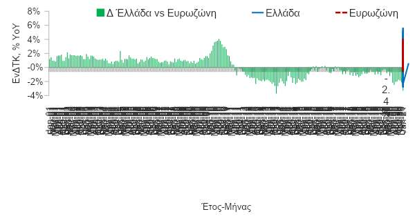 Σχήμα 3: Ελλάδα και Ευρωζώνη, Εναρμονισμένος Δείκτης Τιμών Καταναλωτή (ΕνΔΤΚ)