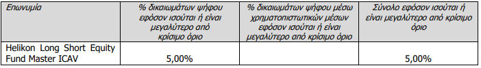 του ν. 3556/2007 και με βάση τη σχετική γνωστοποίηση που έλαβε από την εταιρεία «Helikon Investments Limited» (εφεξής «Helikon»), το ποσοστό των δικαιωμάτων ψήφου επί των κοινών μετοχών της Εταιρείας που κατείχε έμμεσα η Helikon, έφτασε στις 22.06.2021 το όριο του 5% επί του συνολικού αριθμού των δικαιωμάτων ψήφου της Εταιρείας, περιλαμβανομένων των δικαιωμάτων ψήφου του Ταμείου Χρηματοπιστωτικής Σταθερότητας (εφεξής «ΤΧΣ»), ποσοστό που αντιστοιχεί σε 185.618.872 δικαιώματα ψήφου επί μετοχών της Εταιρείας.