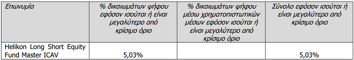 Η Eurobank Ergasias Υπηρεσιών και Συμμετοχών Ανώνυμη Εταιρεία («Εταιρεία») ανακοινώνει, σύμφωνα με τα προβλεπόμενα στο άρθρο 7α (παρ. 6 περ. γ) του ν. 3864/2010, όπως ισχύει, και με βάση τη σχετική γνωστοποίηση που έλαβε από την εταιρεία «Helikon Investments Limited» (εφεξής «Helikon»), ότι το ποσοστό των δικαιωμάτων ψήφου επί των κοινών μετοχών της Εταιρείας που κατείχε έμμεσα η Helikon, υπερέβη στις 16.06.2021 του ορίου του 5% επί του συνολικού αριθμού των δικαιωμάτων ψήφου της Εταιρείας, εξαιρουμένων των δικαιωμάτων ψήφου του Ταμείου Χρηματοπιστωτικής Σταθερότητας, καθώς το ποσοστό δικαιωμάτων ψήφου της Helikon στο μετοχικό κεφάλαιο της Εταιρείας διαμορφώθηκε σε 5,03%, ποσοστό που αντιστοιχεί σε 183.978.322 δικαιώματα ψήφου επί των κοινών μετοχών της Εταιρείας.