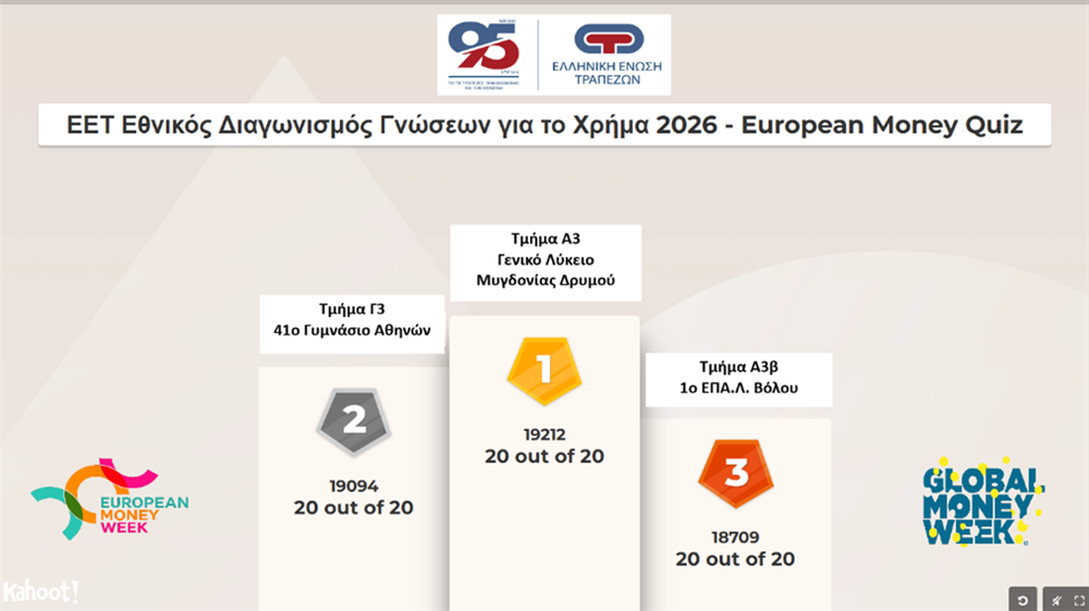 Με τη συμμετοχή 1.881 μαθητών από όλη την επικράτεια ολοκληρώθηκε στις 18 Μαρτίου 2026 ο Ένατος Εθνικός Διαγωνισμός Γνώσεων για το Χρήμα «European Money Quiz», που διοργανώνει η Ελληνική Ένωση Τραπεζών (ΕΕΤ).