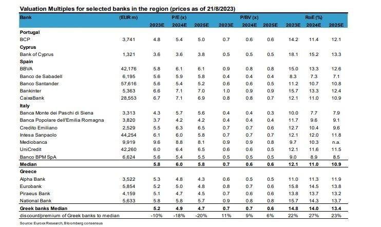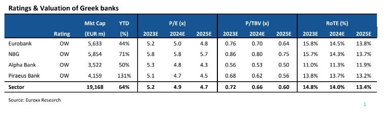 «Ξεκινάμε εκ νέου την κάλυψη των τεσσάρων ελληνικών τραπεζών και υποστηρίζουμε ότι υπάρχει σημαντική μακροπρόθεσμη αξία. Οι ελληνικές τράπεζες διαπραγματεύονται κατά μέσο όρο στις 0,7 φορές την εσωτερική ενσώματη λογιστική αξία P/TBV για το 2023 με βιώσιμο δείκτη αποδοτικότητας ενσώματων ιδίων κεφαλαίων RοTE πάνω από 13%, υποδηλώνοντας υπερβολικό κόστος ιδίων κεφαλαίων του πάνω από 20%. Ο δείκτης αποτίμησης P/E για το 2023 είναι κοντά στις 5 φορές, ένα discount 10% – 20% σε σχέση με τις ανταγωνίστριες τράπεζες, παρά τις ανώτερες αποδόσεις, την υπερβολική παραγωγή κεφαλαίου και τα ισχυρά τοπικά μακροοικονομικά μεγέθη», επισημαίνει Euroxx Χρηματιστηριακή.