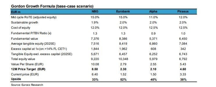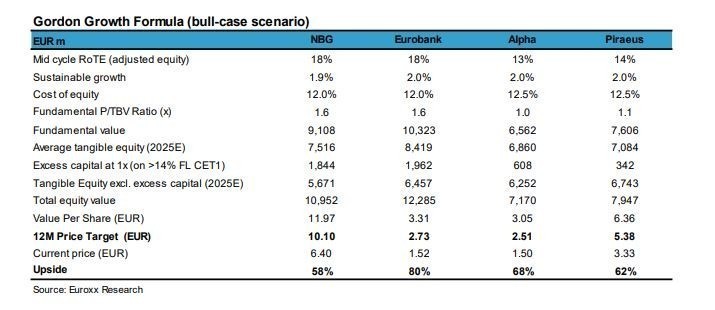 «Η Eurobank είναι η κορυφαία επιλογή μας. Σύμφωνα με τα μοντέλα αποτίμησής μας, υπάρχει δυναμικό ανόδου άνω του 30% για όλες τις ελληνικές τράπεζες. Αν έπρεπε να επιλέξουμε μία, πιστεύουμε ότι η Eurobank προσφέρει το καλύτερο προφίλ κινδύνου / ανταμοιβής εν μέσω ενός καλύτερου στην κατηγορία δείκτη RοTE, πολύ κερδοφόρες δραστηριότητες στη Βουλγαρία και την Κύπρο, υψηλή κάλυψη των NPEs, μια ισχυρή Fully Loaded θέση σε δείκτη CET1 και ένα σαφές σχέδιο για την κατανομή του κεφαλαίου τα επόμενα χρόνια», συνεχίζει η Euroxx Χρηματιστηριακή.