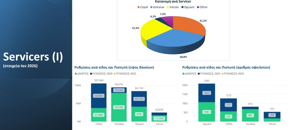 Ενισχυμένη δυναμική συνεχίζουν να εμφανίζουν και οι διμερείς ρυθμίσεις δανείων με τους 4 μεγαλύτερους Servicers (Intrum, Cepal, DoValue, Qquant). Τον Ιανουάριο καταγράφηκαν ρυθμίσεις συνολικού ύψους 309 εκ. ευρώ, οι οποίες αναλογούν σε 4.705 οφειλέτες.