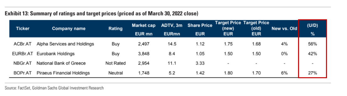 «Aυξάνουμε τις προβλέψεις μας για τα κέρδη ανά μετοχή της Alpha/ΕΤΕ/Πειραιώς κατά 2% κατά μέσο όρο το οικονομικό έτος 2022 και 4% το οικονομικό έτος 2023 (Διάγραμμα 12). Οι εκτιμήσεις μας για τη Eurobank επικαιροποιήθηκαν ήδη την περασμένη εβδομάδα», εξηγεί η άκρως θετική Goldman Sachs.