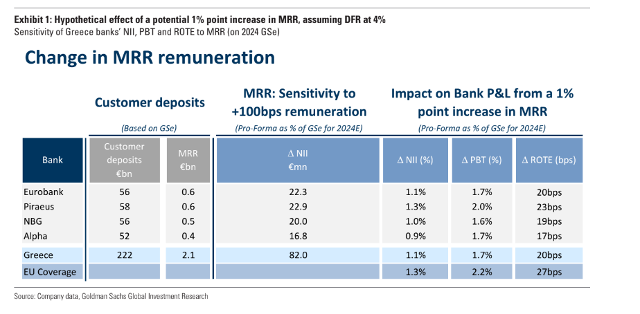 «Η ανάλυση ευαισθησίας μας εκτιμά για τους ισολογισμούς των ελληνικών τραπεζών ότι μια αύξηση κατά 1% του MRR (διπλασιασμός σε σχέση με τα σημερινά επίπεδα) θα είχε ως αποτέλεσμα μείωση κατά 1,1% των καθαρών εσόδων από τόκους για το 2024 (2024 GSe NII_, μια πτώση κατά 1,7% περίπου στα κέρδη προ φόρων και μια μείωση κατά 20 μ.β. περίπου στο δείκτη αποδοτικότητας RοTE (μέσος όρος και σε ετήσια βάση). Πιο συγκεκριµένα, εκτιµούµε στην ανάλυση ευαισθησία των κερδών προ φόρων σε 1,6%/1,7%/1,7%/1,7%/2,0% για ΕΤΕ/Alpha/Eurobank/Πειραιώς. Κατά την εκτίμησή μας, η ελληνική ευαισθησία των τραπεζών στις μεταβολές του MRR θα πρέπει να είναι κάπως χαμηλότερη σε σύγκριση με τις ευρωπαϊκές τράπεζες», προβλέπει η Goldman Sachs. .