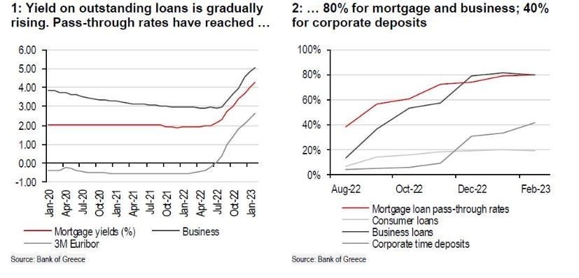 “Αναμένουμε ότι τα καθαρά έσοδα από τόκους (NII) θα κορυφωθούν υψηλότερα το πρώτο εξάμηνο, γεγονός που θα μπορούσε να στηρίξει τις αποτιμήσεις. Η ταχεία ανατιμολόγηση των δανείων των ελληνικών τραπεζών, η υποτονική μετακύλιση στις καταθέσεις, μέχρι στιγμής, και η πρόβλεψη των οικονομολόγων μας για επιτόκιο της ΕΚΤ 350 μ.β. συνεπάγονται υψηλότερη κορύφωση του NII το πρώτο εξάμηνο φέτος”, εξηγεί η τράπεζα.