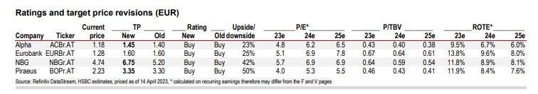 Γις τις εκλογές η HSBC σημειώνει ότι «Η Ελλάδα οδεύει προς βουλευτικές εκλογές τον Μάιο του 2023 και μετά την τραγική σιδηροδρομική καταστροφή που πριν από λιγότερο από δύο μήνες, οι δημοσκοπήσεις δείχνουν ότι οι πιθανότητες να αποκτήσει ένα μόνο κόμμα την πλειοψηφία στο στο κοινοβούλιο έχουν μειωθεί. Η αυξημένη αβεβαιότητα γύρω από τις εκλογές θα μπορούσε να δημιουργήσει κάποιες επιβάρυνση στις αποτιμήσεις- θα μπορούσε να επηρεάσει αρνητικά την οικονομική δραστηριότητα και ως εκ τούτου την πιστωτική ανάπτυξη και την ποιότητα του ενεργητικού των ελληνικών τραπεζών. Προσπαθήσαμε να τα συνυπολογίσουμε αυτά μέσω της μείωσης της εκτίμησής μας για την αύξηση των δανείων για το 2023 και διατηρώντας συντηρητικές τις παραδοχές μας για το κόστος κινδύνου (CoR). Ωστόσο, έχουμε αφήσει το κόστος ιδίων κεφαλαίων (COE) αμετάβλητο στο 14,50%, το οποίο θεωρούμε ότι βρίσκεται κοντά στα υψηλά του».