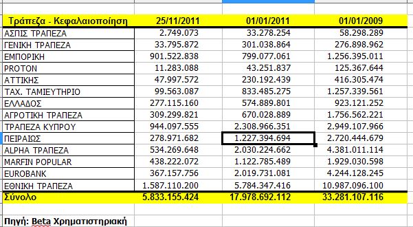 Συγκεκριμένα, στις αρχές του 2009 οι 16 ελληνικές τράπεζες διέθεταν συνολική κεφαλαιοποίηση ύψους 33,2 δις. ευρώ. Δυο χρόνια μετά και αφότου είχε επιβληθεί το πρώτο Μνημόνιο, η κεφαλαιοποίηση των ελληνικών τραπεζών έφθανε τα 17,9 δις. ευρώ. Ο πίνακας που ακολουθεί, δείχνει και τα ποσά που χάθηκαν χρηματιστηριακά ενώ πρέπει να σημειωθεί ότι, οι τράπεζες υλοποίησαν τρεις αυξήσεις μετοχικού κεφαλαίου συνολικού ύψους 39.1 δισ. ευρώ.– ενώ χάθηκαν και τα warrants τα οποία η Ελλάδα κατάφερε να τα απαξιώσει ως χρηματοοικονομικό εργαλείο. Επίσης πρέπει να σημειωθεί ότι, άλλα 13,5 διχ. ευρώ χρησιμοποιήθηκαν για την εκκαθάριση τραπεζών.