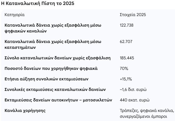 Σημαντική άνοδο κατέγραψε το 2025 η καταναλωτική πίστη στην Ελλάδα, επιβεβαιώνοντας την ισχυρή επαναφορά της ζήτησης για χρηματοδότηση από τα νοικοκυριά, αλλά και τη στροφή του τραπεζικού μοντέλου προς την κατεύθυνση της ψηφιακής εξυπηρέτησης. Οι ελληνικές τράπεζες αξιοποίησαν σε μεγάλο βαθμό τα ψηφιακά τους κανάλια, μετατρέποντας το e-banking και το m-banking σε βασικό μοχλό ανάπτυξης των καταναλωτικών δανείων.
