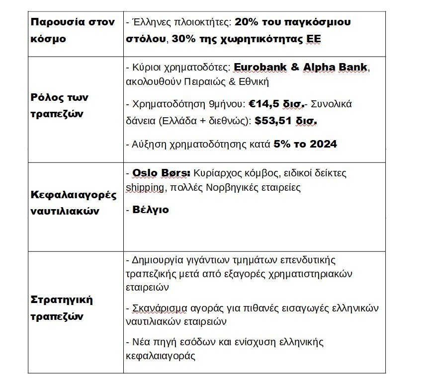 Οι Έλληνες πλοιοκτήτες ελέγχουν περίπου το 20% του παγκόσμιου στόλου και περίπου το 30% της χωρητικότητας της ΕΕ. Πολύ σημαντικές αποφάσεις (επενδύσεις, αγορές πλοίων, χρηματοδότηση) λαμβάνονται στην Αθήνα, όχι στο Όσλο, όχι στο Λονδίνο, όχι στη Νέα Υόρκη όπως θα ανέμενε κανείς. Παρά το γεγονός πως το παγκόσμιο shipping brain είναι στην Αθήνα, απέχει από την κεφαλαιαγορά.