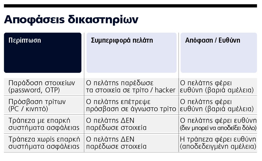 Σε υπόθεση λοιπόν, το δικαστήριο δέχτηκε ότι ο χρήστης ευθύνεται απεριόριστα για ζημίες που υπέστη εξαιτίας δόλου ή βαριάς αμέλειας στην περίπτωση που το πιστωτικό ίδρυμα αποδείξει ότι εφαρμόζει αποτελεσματικούς και εξελιγμένους μηχανισμούς ελέγχου των συναλλαγών, όπως βιομετρική ταυτοποίηση, τηλεφωνική επιβεβαίωση και τεχνολογίες Τεχνητής Νοημοσύνης. Δεν μπορεί να στοιχειοθετηθεί ευθύνη τράπεζας σε περίπτωση που ο χρήστης εν γνώσει του παραδώσει όλα τα απαραίτητα διαπιστευτήρια. Το πιστωτικό ίδρυμα δεν είναι σε θέση να διαπιστώσει ότι ο εκάστοτε χρήστης των προσωπικών, μυστικών διαπιστευτηρίων δεν είναι ο εγκεκριμένος κάτοχος. Εφόσον η τράπεζα παρέχει επαρκή συστήματα ασφάλειας συναλλαγών και εφόσον ανταποκρίνεται άμεσα στο πλαίσιο του εφικτού έπειτα από ενημέρωση του πελάτη για την ύπαρξη ηλεκτρονικής απάτης, δεν ευθύνεται για τη ζημία που υπέστη ο χρήστης.