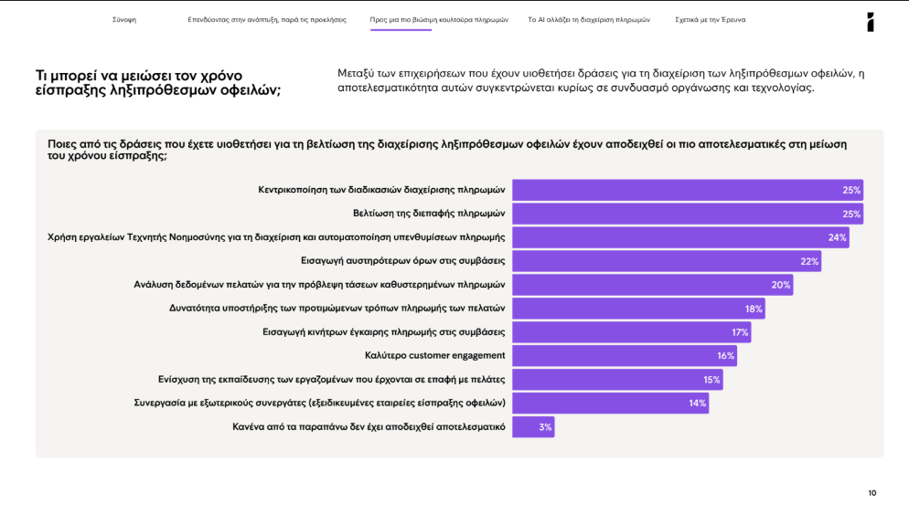 Όσον αφορά τα μέτρα που συμβάλλουν στη μείωση του χρόνου είσπραξης, οι επιχειρήσεις αναδεικνύουν ως πιο αποτελεσματικές πρακτικές την κεντρικοποίηση των διαδικασιών διαχείρισης πληρωμών (25%), τη βελτίωση της διεπαφής πληρωμών (25%) και τη χρήση τεχνητής νοημοσύνης (24%). Ακολουθούν η εισαγωγή αυστηρότερων όρων στις συμβάσεις (22%) και η ανάλυση δεδομένων πελατών (20%).
