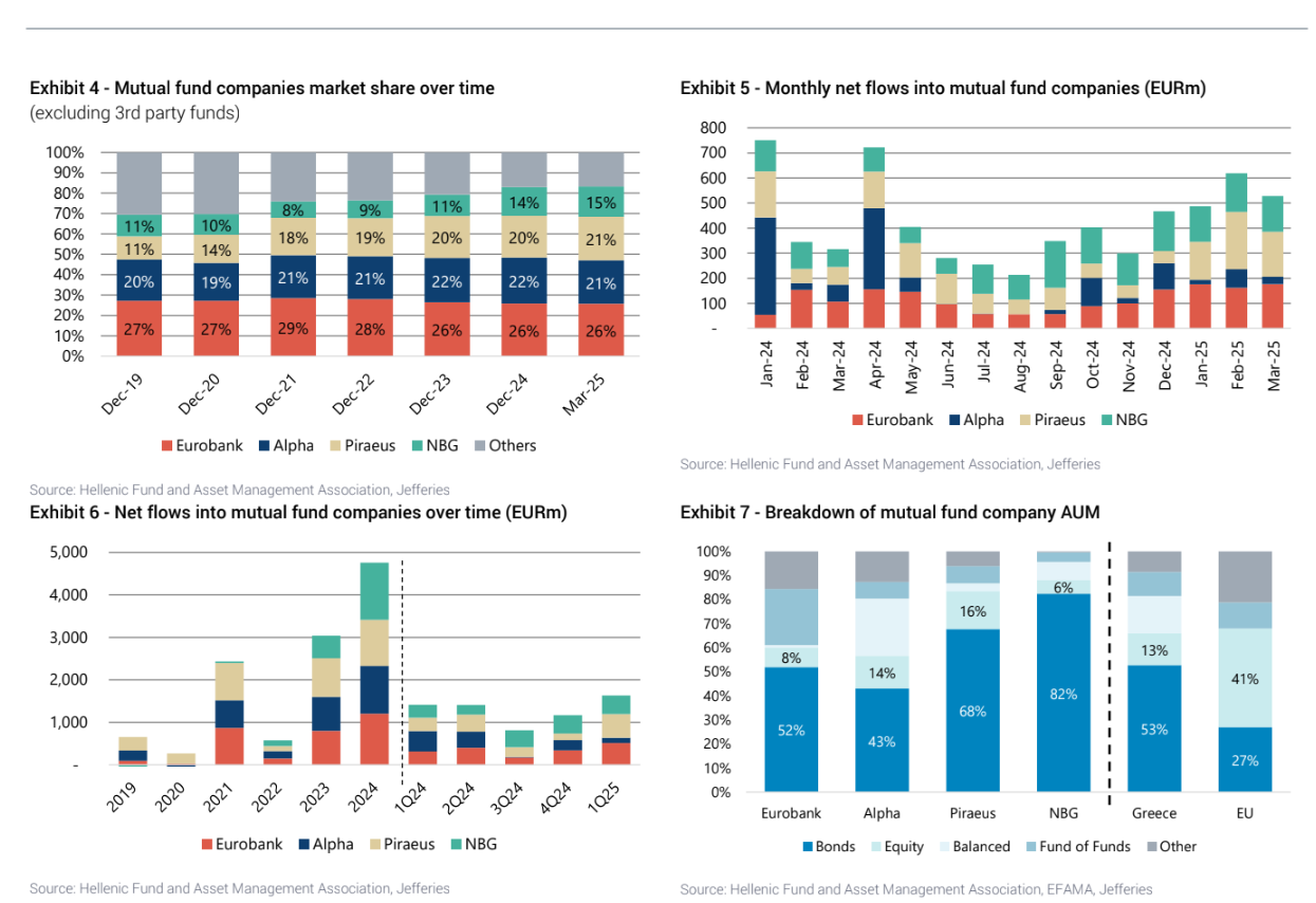 Η Jefferies εκτιμά ότι η φετινή χρονιά ξεκίνησε δυναμικά για τις θυγατρικές διαχείρισης κεφαλαίων των ελληνικών τραπεζών, καθώς τα υπό διαχείριση κεφάλαια (Assets Under Management – AUMs) αυξήθηκαν κατά 9% σε τριμηνιαία βάση στο α’ τρίμηνο (35% σε ετήσια βάση), ενόσω δεν είχαν ακόμη εκδηλωθεί οι επιδράσεις από τη μεταβλητότητα που σχετίζεται με τις πρόσφατες ανακοινώσεις δασμών.