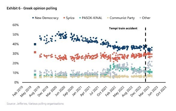 Η αμερικανική Jefferies αναφέρει σε report της ότι οι τελευταίες δημοσκοπήσεις δείχνουν ότι η Νέα Δημοκρατία έχει ανακτήσει μέρος του εδάφους που έχασε μετά τα Τέμπη. «Παρά το sell-off των τραπεζικών μετοχών το Μάρτιο όταν οι δημοσκοπήσεις έδειξαν το κόμμα του ΣΥΡΙΖΑ να πλησιάζει τη ΝΔ, η κυβέρνηση παραμένει μπροστά ενόψει των εκλογών του Μαΐου.