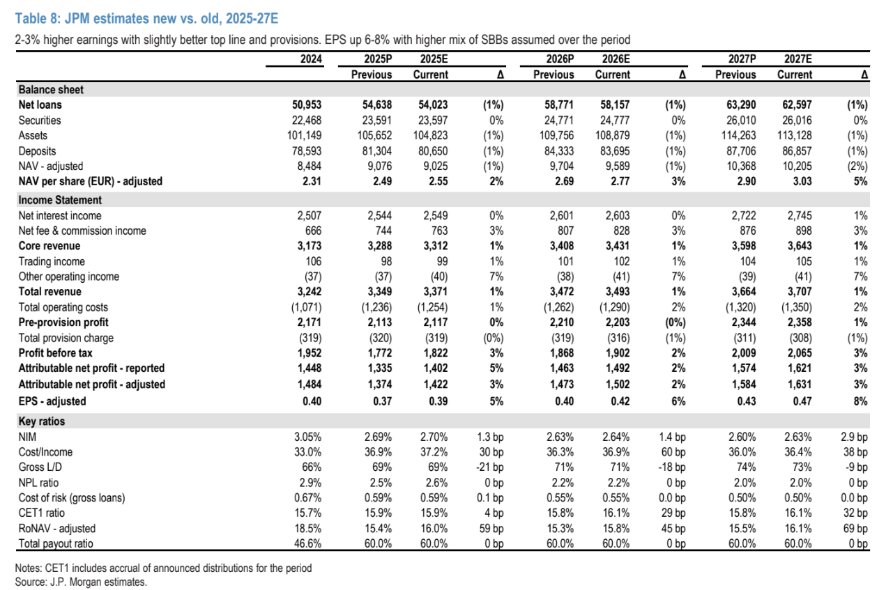 Για την Εθνική Τράπεζα, η J.P. Morgan βλέπει τον μεγαλύτερο δυνητικό μοχλό ανόδου στις διανομές 2025–2027, με τη διοίκηση να στοχεύει σε payout ratio άνω του 70% από το 2026.