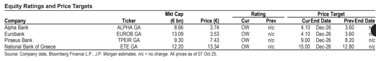 Η έκθεση της JP Morgan, με τίτλο “Greek Banks: Postcard from Athens – Still enough to like” (8 Οκτωβρίου 2025), αποτελεί στην ουσία ένα manifesto επενδυτικής εμπιστοσύνης: «Αυξάνουμε τις τιμές-στόχους σε όλες τις ελληνικές τράπεζες, λόγω υψηλότερων όγκων, χαμηλότερων προβλέψεων, μεγαλύτερων διανομών και χαμηλότερου κόστους ιδίων κεφαλαίων (11,5% από 12%), επαναλαμβάνοντας τις συστάσεις Overweight. Το περιθώριο επανατιμολόγησης έναντι της Ευρώπης παραμένει ουσιαστικό».