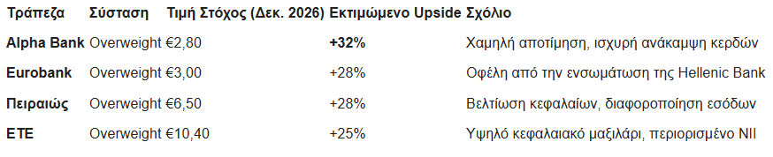 Παρά τις πιέσεις στα επιτοκιακά έσοδα, οι ελληνικές τράπεζες έχουν καταγράψει ισχυρή πορεία το 2025. Η άνοδος των μετοχών είναι +23% σε ετήσια βάση (έναντι +19% του ευρωπαϊκού τραπεζικού δείκτη SX7P). Με βάση τις εκτιμήσεις για το 2026 και 2027 οι αποτιμήσεις των ελληνικών τραπεζών είναι σε όρους P/E για 2026 στις 6,8 φορές, σε όρους P/TBV στις 0,85 φορές, συνδυασμοί με μέσο δείκτη ROTE για το 2027 σε 13,3%. Η επενδυτική πρόταση παραμένει ισχυρή, με μέση εκτιμώμενη άνοδο 30% έως τις τιμές στόχους για Δεκέμβριο 2026.