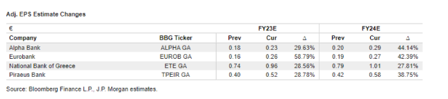 Ιδιαίτερα θετικά είναι τα σχόλια της JP Morgan για το σύνολο των ελληνικών συστημικών τραπεζών, με τον επενδυτικό οίκο να σημειώνει πως αν και οι αναβαθμίσεις που αφορούν το Καθαρό Έσοδο από Τόκους των ελληνικών τραπεζών μπαίνουν στο τελικό τους στάδιο, οι μεσοπρόθεσμες προοπτικές παραμένουν εξαιρετικά θετικές. Σε αυτή την κατεύθυνση ο αμερικανικός οίκος διατηρεί τη σύσταση “overweight” για όλες τις μετοχές των ελληνικών τραπεζών, δίνοντας παράλληλα υψηλότερες τιμές στόχους.