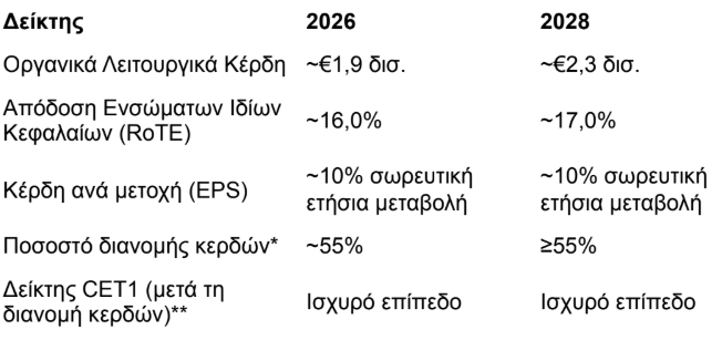 Η Eurobank εμφανίζεται αισιόδοξη για την επόμενη τριετία. Στόχος είναι η απόδοση ενσώματων ιδίων κεφαλαίων να προσεγγίσει το 17% έως το 2028 και τα κέρδη ανά μετοχή να αυξάνονται με μέσο ετήσιο ρυθμό περίπου 10%. Παράλληλα, η σωρευτική διανομή προς τους μετόχους για την περίοδο 2026–2028 αναμένεται αυξημένη κατά περίπου 50% σε σύγκριση με την αντίστοιχη περίοδο 2023–2025, συμπεριλαμβανομένων μερισμάτων και επαναγοράς μετοχών, υπό την έγκριση των αρμόδιων αρχών.