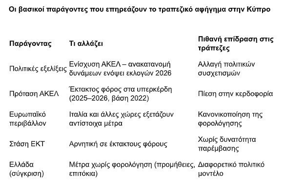 Τι ακριβώς συνιστά «υπερκέρδος» και πώς θα διαμορφωθεί η σχετική φορολόγηση παραμένει προς το παρόν ασαφές. Ωστόσο, το πολιτικό πλαίσιο μεταβάλλεται. Μπορεί ο Πρόεδρος της Κυπριακής Δημοκρατίας να παραμένει στη θέση του για ακόμη τρία χρόνια, όμως η Βουλή αναμένεται να διαλυθεί στις 23 Απριλίου 2026, ενόψει των βουλευτικών εκλογών.
