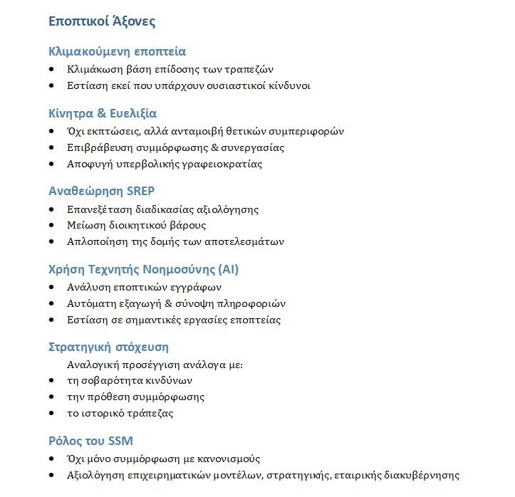 Η στόχευση αφορά μια πιο διαφοροποιημένη και αναλογική διαδικασία, η οποία θα λαμβάνει υπόψη τη φύση και τη σοβαρότητα των προβλημάτων, την προθυμία των τραπεζών να διορθώσουν τις ελλείψεις και το ιστορικό συμμόρφωσής τους.