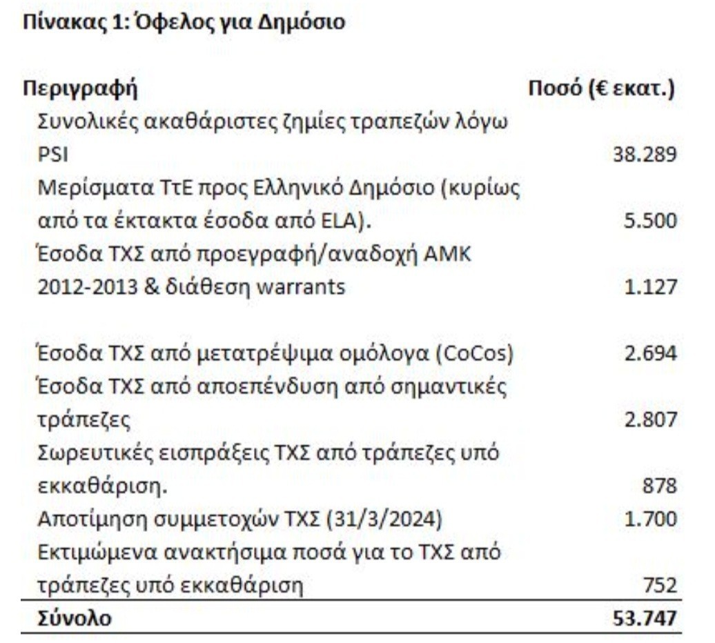 Στον αντίποδα, η συνεισφορά του ΤΧΣ στην πρώτη ανακεφαλαιοποίηση των συστημικών τραπεζών διαμορφώθηκε σε 25,5 δισ. ευρώ και η συνεισφορά του στην εξυγίανση μη συστημικών τραπεζών σε 14,4 δισ. ευρώ. Στη συνέχεια, το ΤΧΣ συμμετείχε στην ανακεφαλαιοποίηση των σημαντικών τραπεζών του 2015 με 5,4 δισ. ευρώ σε μετοχές και μετατρέψιμα ομόλογα (contingent convertibles – CoCos). Στο συνολικό κόστος για το Ελληνικό Δημόσιο πρέπει νασυνεκτιμηθεί η μετατροπή των οριστικών και εκκαθαρισμένων φορολογικών απαιτήσεων (deferred tax credit – DTCs της Τράπεζας Αττικής), καθώς και η συμμετοχή του ΤΧΣ στην αύξηση μετοχικού κεφαλαίου της Τράπεζας Αττικής. Τέλος, θα μπορούσε να ληφθεί υπόψη και το ύψος των DTC των σημαντικών τραπεζών που έχει ήδη αποσβεστεί (3,7 δισ. ευρώ). Κοινώς, το όφελος για το Δημόσιο από την στήριξη των τραπεζών ανέρχεται σε 53,747 δισ. ευρώ (ΠΙΝΑΚΑΣ 1) και το κόστος σε 50,282 δισ. ευρώ (ΠΙΝΑΚΑΣ 2).