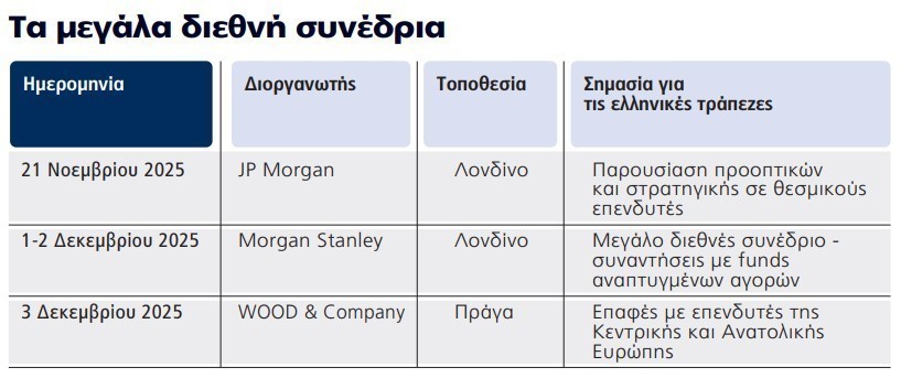 Στις 21 Νοεμβρίου πραγματοποιείται το χρηματοοικονομικό συνέδριο της JP Morgan στο Λονδίνο, ενώ την 1η και 2 Δεκεμβρίου πραγματοποιείται το μεγάλο συνέδριο της Morgan Stanley επίσης στο Λονδίνο. Τέλος, στις 3 Δεκεμβρίου η WOOD οργανώνει συνέδριο στην Πράγα.