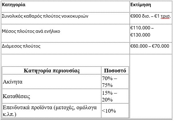 Ο συνολικός καθαρός πλούτος των ελληνικών νοικοκυριών εκτιμάται κοντά στα 900 δισ. ευρώ, με τον μέσο πλούτο ανά ενήλικο να κυμαίνεται περίπου μεταξύ 110.000 και 130.000 ευρώ και τον διάμεσο να διαμορφώνεται στις 60.000 με 70.000 ευρώ.