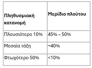 Η απόκλιση αυτή υποδηλώνει σαφή ανισοκατανομή, με το ανώτερο 10% να κατέχει σχεδόν το 45% έως 50% του συνολικού πλούτου, ενώ το χαμηλότερο 50% λιγότερο από το 10%.