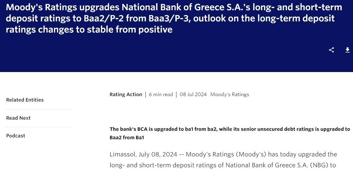 Σημειώνεται ότι η σημερινή αναβάθμιση έρχεται έναν μήνα μετά την αναβάθμιση της Eurobank και της Alpha Bank από τον οίκο αξιολόγησης.