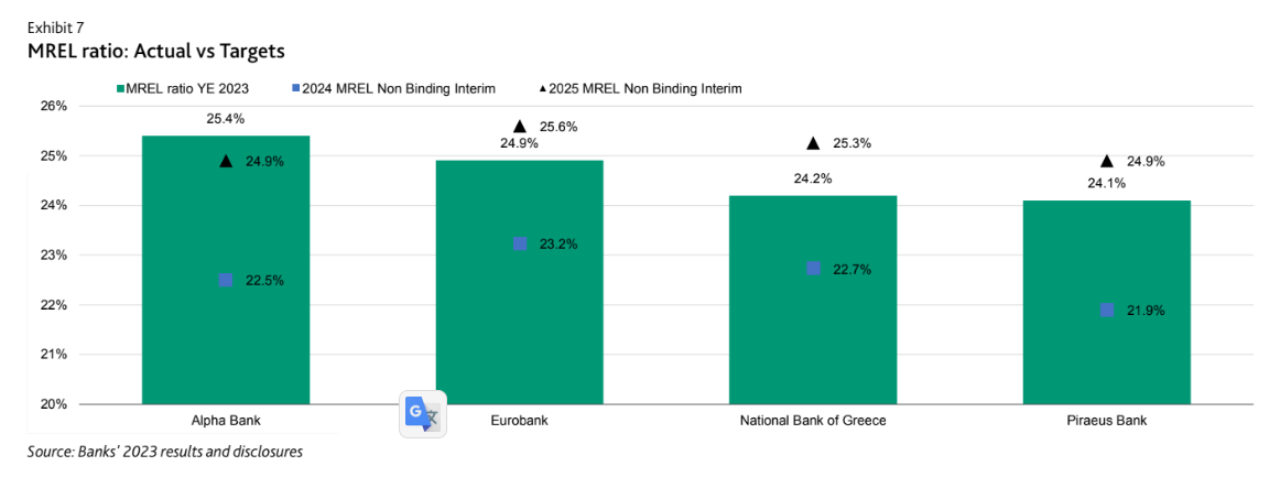 «Επιπλέον, και οι τέσσερις τράπεζες συνέχισαν να αξιοποιούν τις διεθνείς κεφαλαιαγορές κατά τη διάρκεια του 2023 και στις αρχές του 2024, προκειμένου να καλύψουν τις απαιτήσεις MREL έως το 2025. Κατά τη διάρκεια του 2023, οι τέσσερις συστημικές τράπεζες άντλησαν περίπου 2,6 δισ. ευρώ σε προνομιούχο χρέος πρώτης κατηγορίας με σταθμισμένο μέσο επιτόκιο κουπονιού 6,8% και σταθμισμένη μέση διάρκεια 5,8 ετών. Οι ελληνικές τράπεζες συνέχισαν τις εκδόσεις τους στις αρχές του 2024 (2,3 δισ. ευρώ μέχρι στιγμής), δεδομένου ότι είναι πλέον σε θέση να αξιοποιήσουν τις διεθνείς κεφαλαιαγορές με φθηνότερα επιτόκια μετά τις προοδευτικές αναβαθμίσεις της πιστοληπτικής τους ικανότητας τα τελευταία χρόνια», εξηγεί ο οίκος.