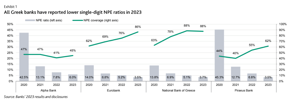«Οι τράπεζες ήταν σε θέση να μειώσουν περαιτέρω τα προβληματικά τους δάνεια και να διατηρήσουν άνετη χρηματοδότηση και ρευστότητα, συγκλίνοντας πιο κοντά στον ευρωπαϊκό μέσο όρο των μεγάλων τραπεζών της ΕΕ. Τα μη εξυπηρετούμενα ανοίγματα συνέχισαν να μειώνονται κατά τη διάρκεια του 2023, μειώνοντας τα σταθμισμένα μέσο δείκτη NPE σε περίπου 4,1%, από 6,2% το 2022 και από το μέγιστο 49% τον Δεκέμβριο του 2016. Σε αυτό το επίπεδο, οι τέσσερις τράπεζες συγκλίνουν πιο κοντά στον μέσο όρο των μεγάλων τραπεζών της ΕΕ που είναι 2,3%. Κατά τη διάρκεια του τρέχοντος έτους, οι τράπεζες θα δυσκολευτούν περισσότερο να επιτύχουν οποιαδήποτε σημαντική μείωση ΝΡΕ εν μέσω υψηλών επιτοκίων, αν και η πτωτική τάση είναι πιθανό να διατηρηθεί», επισημαίνει ο αμερικανικός οίκος αξιολόγησης.