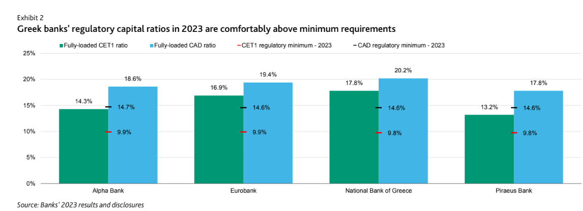 «Μετά τη σημαντική οργανική δημιουργία κεφαλαίων κατά τη διάρκεια του 2023, οι ελληνικές τράπεζες ανέφεραν σχετικά άνετα εποπτικά κεφάλαια δείκτες πάνω από τις ελάχιστες απαιτήσεις τους. Ο μέσος δείκτης πλήρως επιβαρυμένων κοινών μετοχών της κατηγορίας 1 (CET1) διαμορφώθηκε σε 15,7% το 2023 έναντι 13,8% το προηγούμενο έτος, ενώ ο μέσος όρος του συνολικού δείκτη κεφαλαιακής επάρκειας (CAD) τους ήταν 19,1% το 2023 από 16,9% το 2022. Το κεφάλαιο CET1 για τις τέσσερις τράπεζες παρουσίασε πολύ μεγαλύτερη αύξηση σε σύγκριση με την αύξηση του σταθμισμένου ως προς τον κίνδυνο ενεργητικού τους κατά τη διάρκεια του 2023. Η κεφαλαιακή βάση των τεσσάρων τραπεζών υποστηρίχθηκε από τα παρακρατηθέντα κέρδη, ενώ οι δείκτες αυτοί ενσωματώνουν επίσης σχέδια για μέτριες πληρωμές μερισμάτων το 2024 (μετά από περισσότερο από μια δεκαετία), εφόσον υπάρξει έγκριση από τις ρυθμιστικές αρχές. Οι μέσοι όροι CET1 και CAD για τις μεγάλες ευρωπαϊκές τράπεζες ήταν 15,6% και 19,7% αντίστοιχα τον Σεπτέμβριο του 2023, γεγονός που δείχνει ότι οι ελληνικές τράπεζες ήταν σε θέση να επιτύχουν επίπεδα κεφαλαίου παρόμοια με τα αντίστοιχα των ομολόγων τους, με στόχο την περαιτέρω αύξηση των βασικών ιδίων κεφαλαίων τους έως το 2026», εξηγεί ο οίκος.