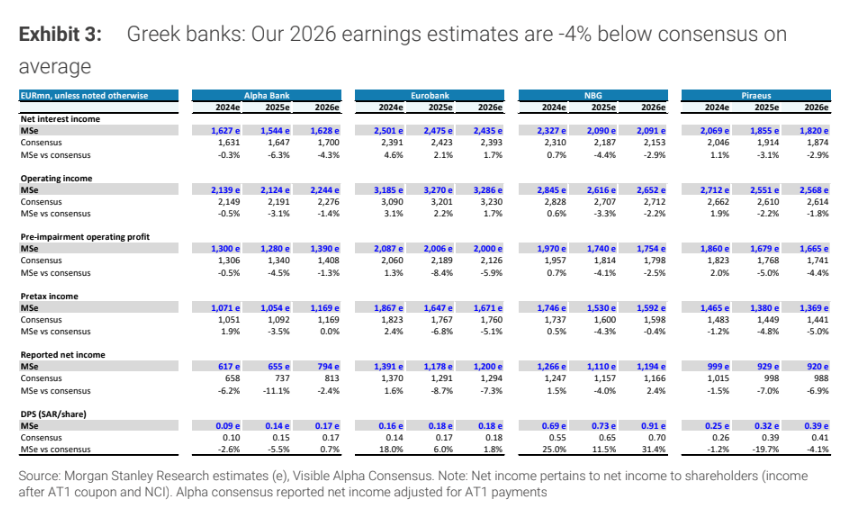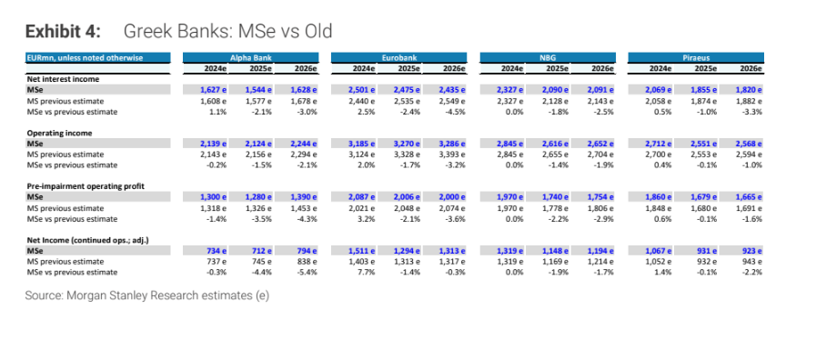 Η Morgan Stanley μετά τις συναντήσεις της με τις ελληνικές τράπεζες, κυβερνητικούς αξιωματούχους και παράγοντες του κλάδου διατηρεί την εποικοδομητική της στάση αν και προχωράει σε οριακές μειώσεις στις τιμές στόχους. Οι νέες τιμές στόχοι είναι για την Αlpha Bank στα €2,28 από τα €2,50, στην Εθνική Τράπεζα σε €10,25 από τα €10,43, για την Τράπεζα Πειραιώς στα €5,39 από €5,51 και για την Eurobank στα €2,63 από τα €2,66.