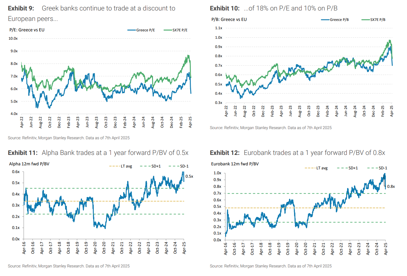 Η Morgan Stanley θεωρεί ότι, στις τρέχουσες αποτιμήσεις, οι ελληνικές τράπεζες εμφανίζονται ελκυστικές. Συγκεκριμένα: