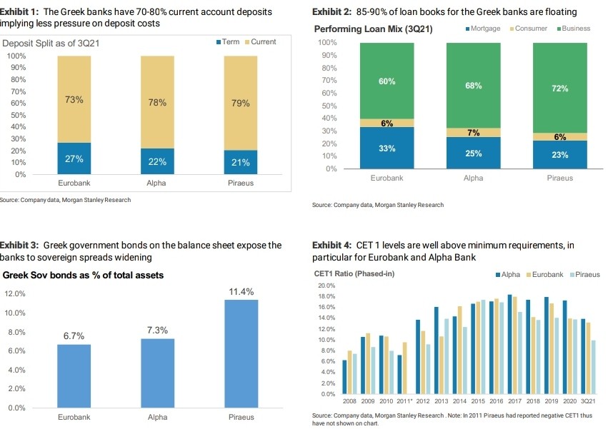 Σύμφωνα με τις συζητήσεις της αμερικανικής τράπεζας με τις εγχώριες τράπεζες, το 85% (Alpha) έως το 90% (Eurobank και Πειραιώς) του χαρτοφυλακίου δανείων των ελληνικών τραπεζών είναι με κυμαινόμενο επιτόκιο. Το παθητικό, το 73% (Eurobank) έως 78%-79% (Alpha Bank και Πειραιώς) των καταθέσεων είναι καταθέσεις όψεως, γεγονός που συνεπάγεται λιγότερες άμεσες πιέσεις στις καταθέσεις από ανατιμολόγηση.