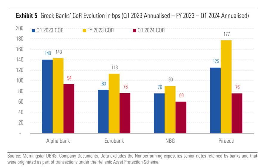 Ο οίκος αξιολόγησης Morningstar DBRS επισημαίνει ότι οι ελληνικές τράπεζες συνέχισαν να σημειώνουν πρόοδο, όσον αφορά τη μείωση του κόστους του κινδύνου (Cost of Risk). Το πρώτο τρίμηνο του 2024, ο μέσος όρος του CoR για τις τέσσερις συστημικά σημαντικές ελληνικές τράπεζες μειώθηκε στις 77 μονάδες βάσης (μ.β.), σημαντικά μειωμένος από τις 131 μ.β. το οικονομικό έτος 2023 και 106 μ.β. το πρώτο τρίμηνο του 2023 και σημαντικά βελτιωμένη από τις 182 μ.β. το 2019.