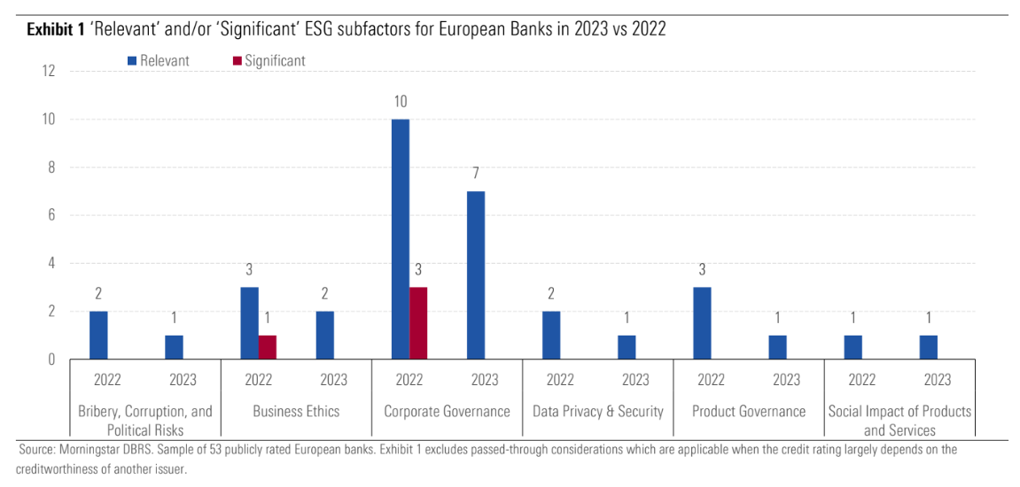 Ο αριθμός των ευρωπαϊκών τραπεζών που εντοπίστηκαν να αντιμετωπίζουν ζητήματα ESG που ήταν σημαντικά για την πιστοληπτική αξιολογήσεις μειώθηκε το 2023 σε σύγκριση με τα επίπεδα του 2022, χωρίς να υπάρχουν σημαντικοί παράγοντες ESG που να επηρεάζουν τις αξιολογήσεις πιστοληπτικής ικανότητας σε αντίθεση με τρεις τράπεζες που επηρεάστηκαν από σημαντικούς παράγοντες διακυβέρνησης το προηγούμενο έτος, γεγονός που τυπικά θα υποδήλωνε ότι οι τράπεζες αποκαθιστούν με επιτυχία τα ζητήματα διακυβέρνησης.
